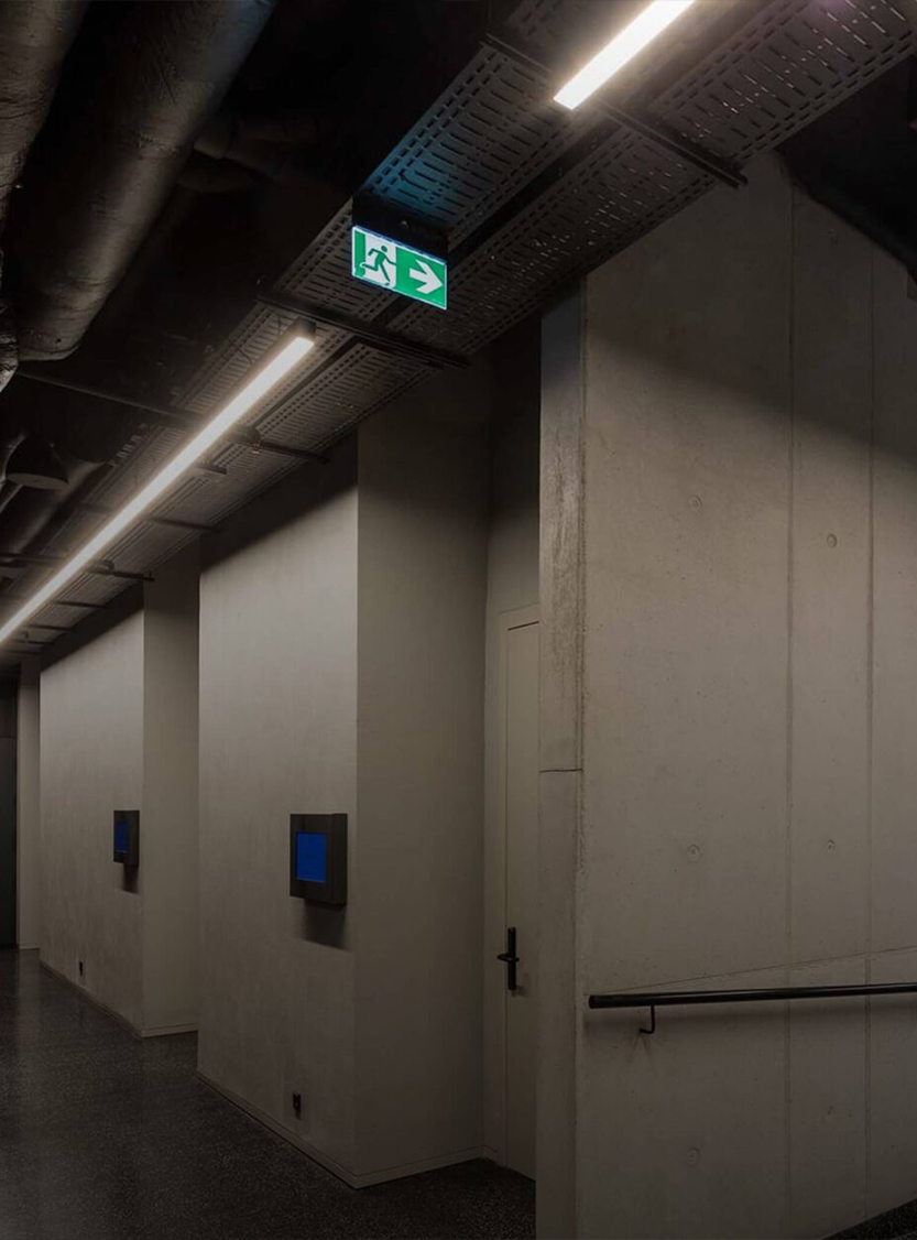 Oświetlenie ewakuacyjne projektujemy z myślą o dyskretnym wkomponowaniu się w architekturę obiektu.